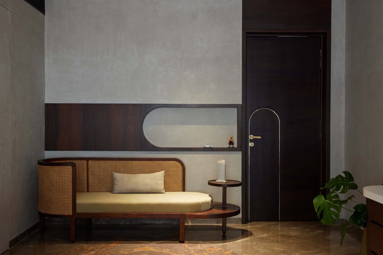 The entryway of the house sets the stage with its array of graceful archways, signaling the home’s distinctive design ethos. These arches not only frame the interior views but also create a warm embrace through their soft forms. The foyer seamlessly transitions into the drawing room, where an array of graceful archways defines the space. These arches frame interior views while fostering an inviting atmosphere that encourages interaction among family members and guests alike. Emphasizing warmth and connectivity, the design ensures a natural flow between each area. In this space, soft lighting complements the rich textures of materials like walnut wood and grey marble, enhancing the overall ambiance. The drawing room serves as both a gathering place for socializing and a serene retreat for quiet moments. Thoughtfully placed furniture invites relaxation while maintaining an elegant aesthetic that reflects the homeowner’s style.