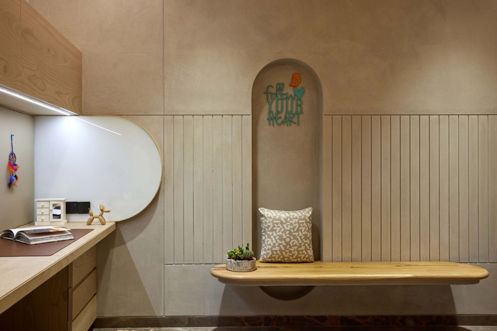 In contrast to her brother’s room, the daughter’s bedroom features a monochromatic light oak veneer backdrop