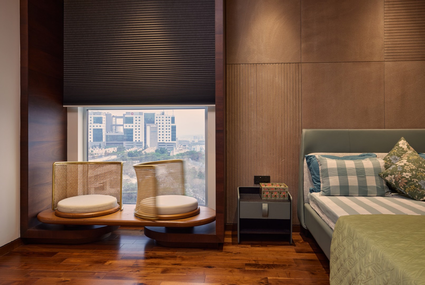 The parent’s bedroom offers a serene escape characterized by deep ocean blue texture veneers against rich walnut wood accents. This sophisticated color scheme promotes tranquility while providing an elegant backdrop for restful nights. Carefully  selected furnishings
