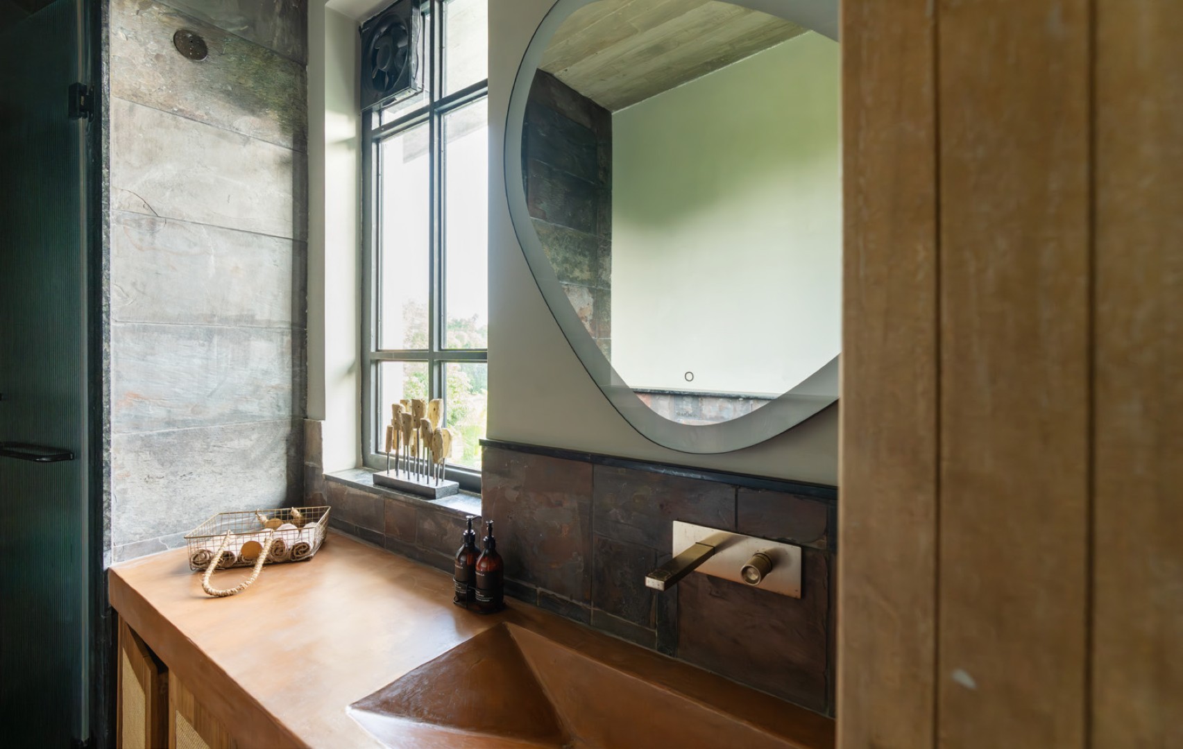 The exterior palette features grey textures from concrete and limestone flooring, seamlessly blending with rust-red terracotta bricks. This striking contrast enhances visual interest while maintaining earthy tones that complement the natural surroundings. The design fosters a sense of continuity between indoor and outdoor spaces, creating a cohesive aesthetic that encourages exploration and relaxation throughout the property.