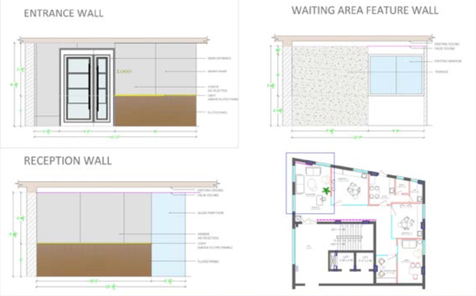 The office cabin boasts standout elements, including an eye-catching feature wall adorned with wooden panels, perfectly complemented by elegant grayish-blue sofas. This striking combination adds depth and character, instantly becoming the focal point of the office space.