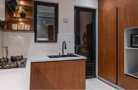 In describing the dining room, the spotlight is on the dining wall’s unique quality, accentuated by mirrors that strategically fill the space with light and depth, creating an illusion of greater size. This intentional integration of reflective surfaces not only enhances the room’s aesthetic allure but also fosters an atmosphere of spaciousness and airiness. Complementing this effect, lighting fixtures above the dining table add warmth and intimacy to the room’s ambiance. Marble accents throughout exude elegance, while grey-colored chairs contribute to a modern and versatile aesthetic. Such meticulous attention to detail underscores a commitment to both visual appeal and functional design principles, resulting in a dining space that is both visually stunning and welcoming for gatherings and meals.
